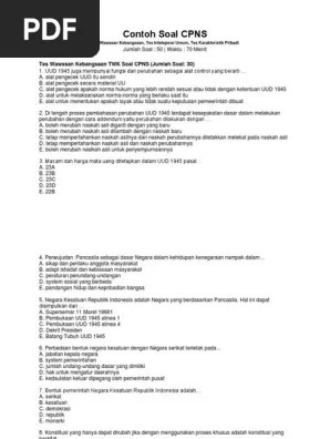 Detikers lagi cari contoh soal tiu cpns 2021 pdf? Perlu anda ketahui juga bahwa tahapan yang penting di dalam proses seleksi cpns di tahun 2021 ini adalah bagian seleksi kompetisi dasar (skd), yang mana pelamat . Itulah contoh soal tes wawasan kebangsaan (twk) 2021 yang akan membantu anda untuk belajar menghadapi . Demikian pembahasan dan link download latihan soal skd cpns yang sudah berupa file pdf. Latihan soal tes cpns (pdf) tahun 2021/2022 dan pembahasannya.